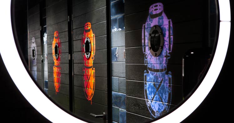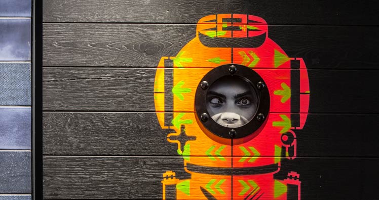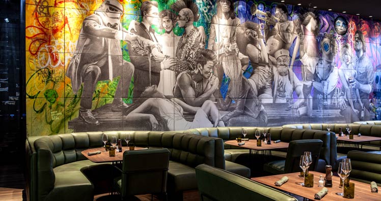 Spätestens der zweite Blick fällt auf die Wandbemalung, vor allem auf das große, wandfüllende bewegliche Bild, an der Rückseite des Lokals. "Das Bild entstand durch Zufall. Mein ehemaliger Schulkollege Akira Sakurai wechselte von der Gastronomie zur Kunst und ist jetzt mit Grafik und Malerei sehr erfolgreich. Es gelang ihm, auf meinen Wunsch, den Donaukanal hier herauf zu transportieren. Um wiederum ungewolltem Schickimicki-Charakter auszuweichen, arbeiteten wir mit Graffitis, das bringt alles auf den Boden, das Lokal wirkt ein bisschen erdiger. Dank einer besonderen Technik – aus Zement und schwarzem Sand wird ein Relief erstellt und mit Graffitis noch ergänzt – entsteht ein zuerst graues Bild, das von einem Lichtkünstler belebt wird. Das Werk ist eine Kombination aus Malerei und Projektion, ein lebendes Bild, das sich permanent verändert.“