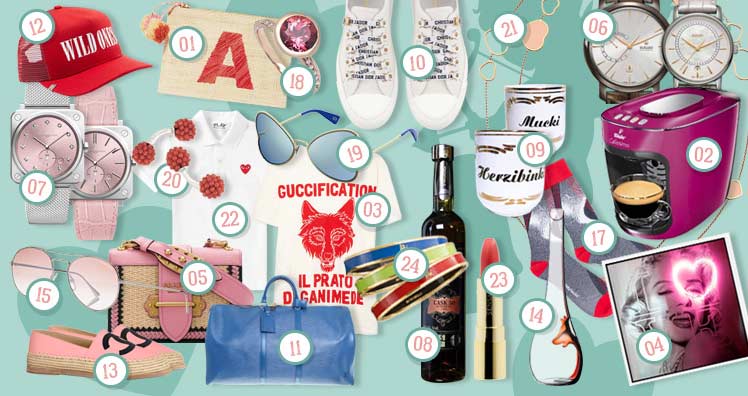 But first Coffee: Die Cafissimo MINI (02)bringt nicht nur die Küche zum Leuchten. Schmeckt "Mucki", "Hasi" und "Schatzi" am besten in feinem Porzellan mit einer Aufschrift die persönlicher nicht sein kann (09). Höchst individuell ist auch der Beutel von Kayu - er wurde manuell aus sandfarbenem Stroh gewebt und mit je einem individuellen Buchstaben bestickt (01).