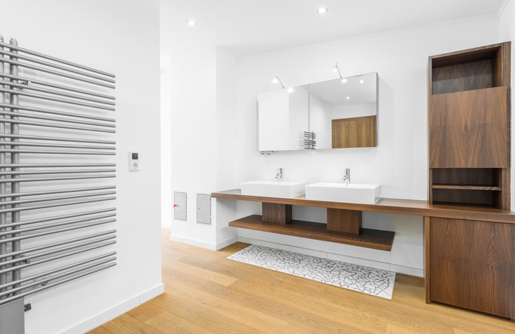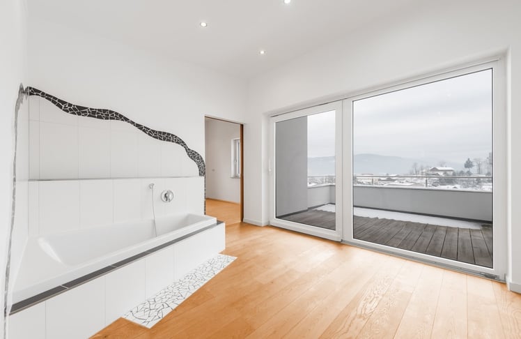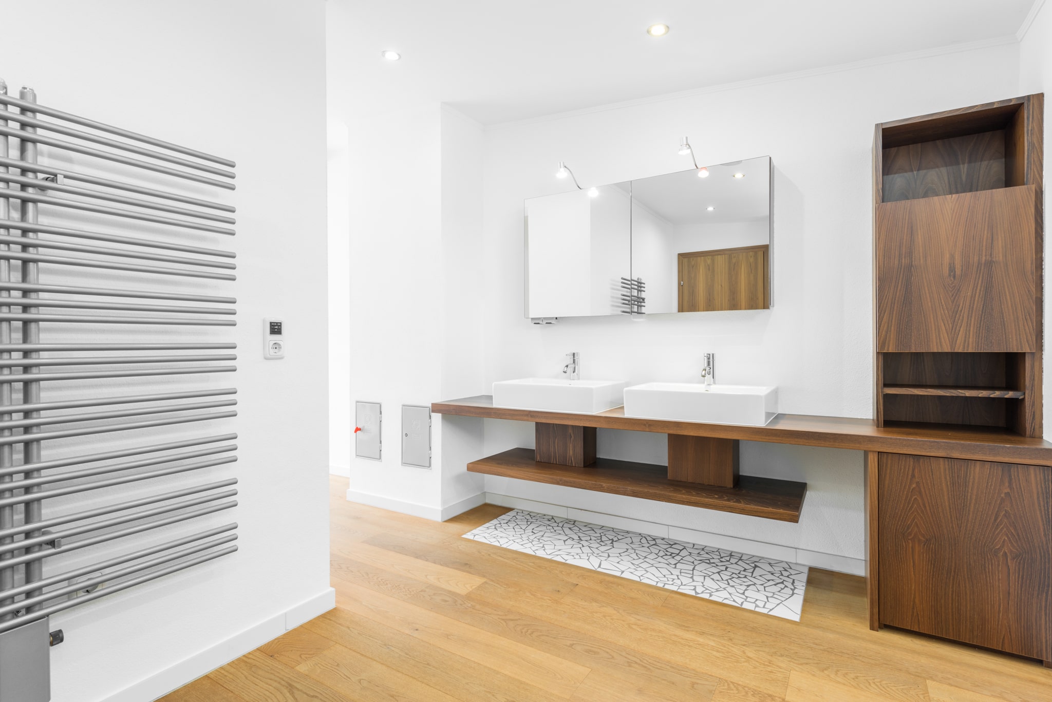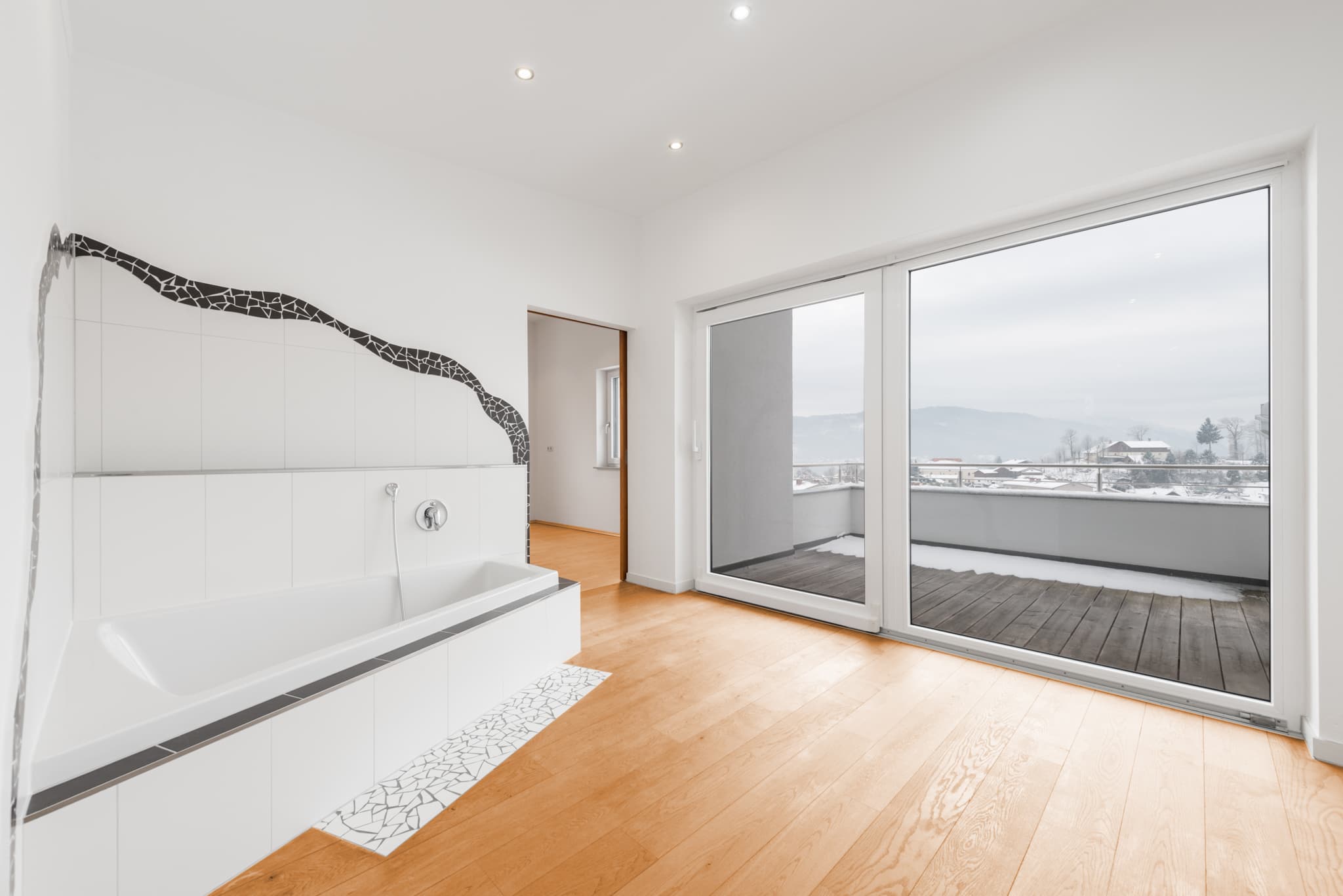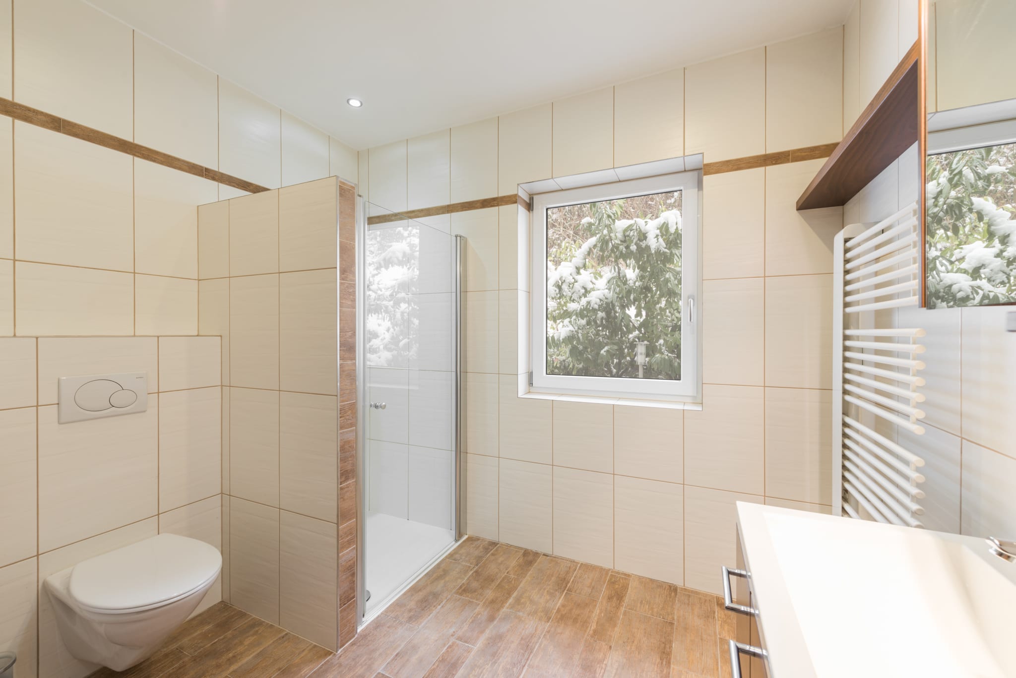 Sowohl im ersten, als auch im zweiten Stock befindet sich jeweils ein geschmackvoll eingerichtetes Badezimmer mit Duschkabine und hochwertiger Ausstattung. Außerdem in beiden Stöcken vorhanden ist eine separate Toilette. Das Badezimmer im zweiten Obergeschoß ist großzügig gestaltet. Auch hier kann man während einem gemütlichen Schaumbad den Ausblick auf die großartige Landschaft genießen. Der direkte Zugang zum Schlafzimmer, sowie der Balkon runden das Ganze ab und verleihen diesem Bereich der Etage einen charmanten Hotelcharakter.