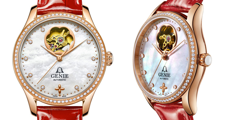 Die neue Damenuhrkollektion Genie Goddess Series vereint das zeitlose Design einer traditionellen Schweizer Uhr mit der eleganten Ästhetik der Natur. Neben ihrem schimmernden Perlmutt-Zifferblatt und den 70 funkelnden Swarovski-Kristallen, die zum einen als Indexe fungieren und darüber hinaus auch die Lünette veredeln, präsentiert dieses Genie-Modell subtile gestalterische Elemente, die an florale Themen anklingen. Ein blumenförmiges Fenster bei 12 Uhr gibt den Blick auf das Regulierungssystem des Swiss-made-Automatikwerks, das in einem 33-Millimeter roségoldfarbenen Edelstahlgehäuse untergebracht ist, frei. Bei 6 Uhr platzierte Genie ein weiteres florales Element, ebenfalls im Sinne des gesamt-femininen Auftritts. (red)