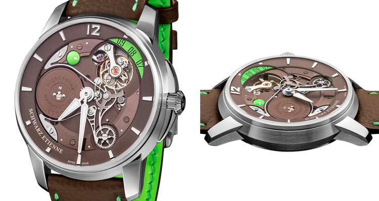 Die Schwarz Etienne Roswell 08 verfügt über eine lebendige Ästhetik, die ein High-Tech-Manufakturwerk mit einem speziellen Zifferblatt-Design verbindet. Auf der linken Seite des Zifferblatts ist der innovative Datumsmechanismus von Schwarz Etienne zu sehen, bei dem das Datum über ein spezielles System mit Schnelleinstellungsfunktion und Sicherheitsmechanismus angetrieben wird. Durch das tabakbraune, weitgehend durchbrochene Zifferblatt tritt das Manufakturkaliber ISE-100.11 mit Mikro-Rotor-Aufzug und beeindruckender Gangreserve von vier Tagen zutage. Gefasst ist das Werk in ein rundes, charakterstarkes 45-mm-Edelstahlgehäuse, zudem auch das braune Strukturleder-Armband sehr gut passt.