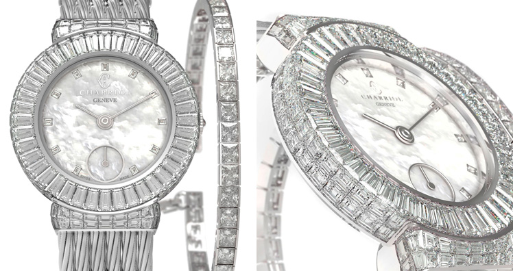 Das glamouröse, großzügig mit Diamanten besetzte Modell aus der Charriol St-Tropez™-Kollektion, verdankt seinen Namen dem unsichtbaren Crimp-Besatzsystem. An sein, mit 135 weißen Diamanten besetztes Gehäuse aus Weißgold, ist eine Kette angebracht, die ihrerseits ebenfalls mit großen, unsichtbar in Weißgold gefassten Diamanten im Baguetteschliff bestückt ist. Mit einer Breite von nur 30 Millimetern und den zwölf Diamant-Indexen im Prinzessschliff auf dem weißen Perlmutt-Zifferblatt, strahlt die Charriol St-Tropez Invisible eine zeitlose Schönheit aus. In ihrem Inneren arbeitet ein Schweizer ETA-Quarzwerk mit Stunden- und Minutenanzeige und kleiner Sekunde, ein sechssträngiges Edelstahlarmband mit zwei Verzierungen aus Weißgold unterstreicht die ästhetische Wirkung der Luxusuhr.