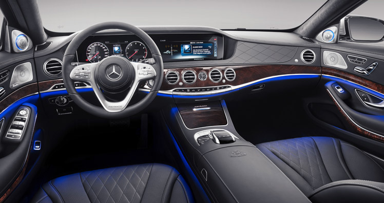 Exklusiv für die Maybach S-Klasse werden die Innenausstattungen armagnacbraun/schwarz und savannabeige/schwarz angeboten. Die Ausstattung Polster Leder Exklusiv Nappa Maybach schwarz gibt es wahlweise mit kupfer-, gold- oder platinfarbenen Kontrastnähten. Ebenfalls neu im Angebot sind Zierelemente in designo Magnolie flowing lines.