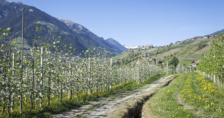 60 Millionen Apfelbäume mit 120 Milliarden Apfelblüten erblühen in Südtirol. Die Gipfel noch schneeweiß, bedeckt ein zart-rosa Teppich die Täler. Möglich machen dies ein submediterranes Mikroklima und die geschützte geographische Lage: Während die Texelgruppe mit ihren Dreitausendern das Meraner Becken vor kalten Winden gegen Norden und Nordwesten abschirmt, strömt von Süden warme Luft vom Mittelmeer ein. Das Meraner Land ist bekannt für seine 300 Sonnentage im Jahr, Bewegung an der frischen Luft macht daher zu jeder Jahreszeit großen Spaß.