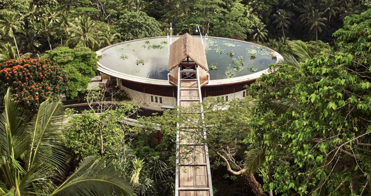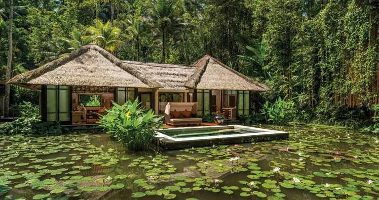 Eine tatsächlich außergewöhnliche Alternative stellt das zweite verschwiegene Resort dar. Allein der Weg dorthin ist spektakulär. Eine Brücke führt über den heiligen Ayung-Fluss zu einem Lotusteich, der zwischen Baumwipfeln zu schweben scheint. Sattes Grün, Palmenwälder und Reisterrassen soweit das Auge reicht, dazwischen verbirgt sich ein wunderbarer Platz für entspannende Momente.