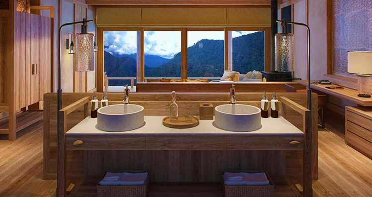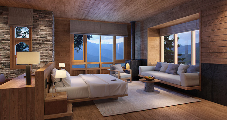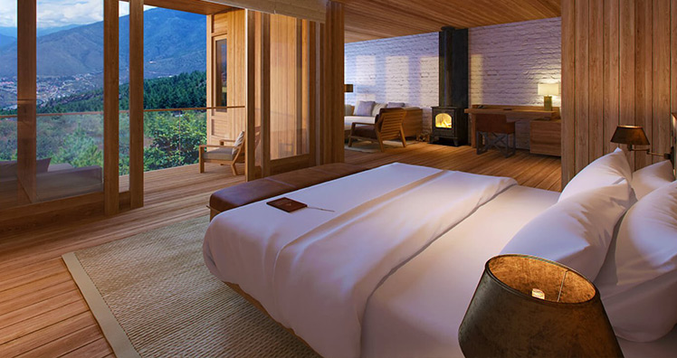 In Thimphu, der Hauptstadt des Königreichs Bhutan befindet sich das größte der fünf Resorts. Das Haus und die Außenterrasse sind von einer großen Wasserfläche und von Steinmauern umgeben. Im Inneren schafft ein Kamin in der Suite eine gemütliche Atmosphäre. Für die Einrichtung der gemütlichen Zimmer wurden harmonische Farben und natürliche Materialien ausgewählt.