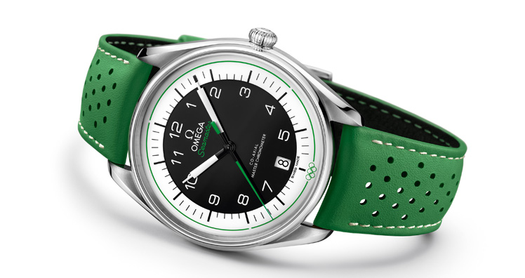 Omega bringt mit der „Seamaster“ aus der Omega Olympic Games Collection einen auf weltweit 2.032 Exemplare limitierten Zeitmesser mit grünem, gelochten Lederarmband sowie grünen Designelementen. Die Uhren mit einem Durchmesser von 39,5 mm sind aus Edelstahl gefertigt und an der Gehäuseseite mit der eingravierten Limitierungsnummer versehen. Auf dem Gehäuseboden befindet sich ein eloxierter Aluminiumring, der das Master Chronometer Kaliber 8800 umrahmt und auf dem alle Austragungsorte und Termine der Olympischen Spiele mit Beteiligung der Marke verewigt wurden.