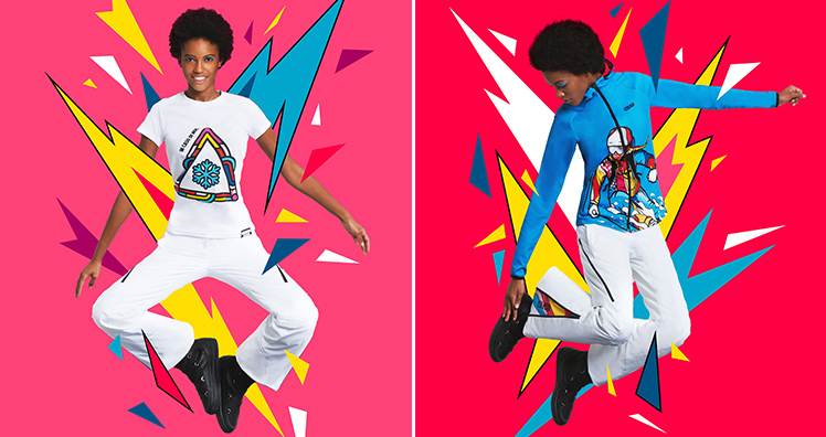 Die Designer verwandelten die Skifahrer und den Colmar-Werbeslogan der 1970er-Jahre „Im Falle von Schnee ... Colmar“ jeweils in eine Jacke, ein Fleece und ein T-Shirt, wo sich alle Van Orton Design-Stile wiederfinden: der an Pattern und Texturen reiche geometrische Stil sowie der weichere und künstlerischere. Das Symbol der Flocke im Dreieck wurde ebenfalls überarbeitet und dann auf einen Vorschlag für ein Jersey-T-Shirt zusammen mit dem PopMountain-Remake des „C“ appliziert.