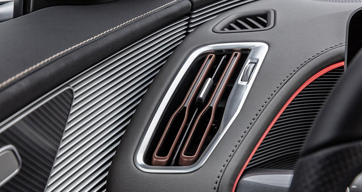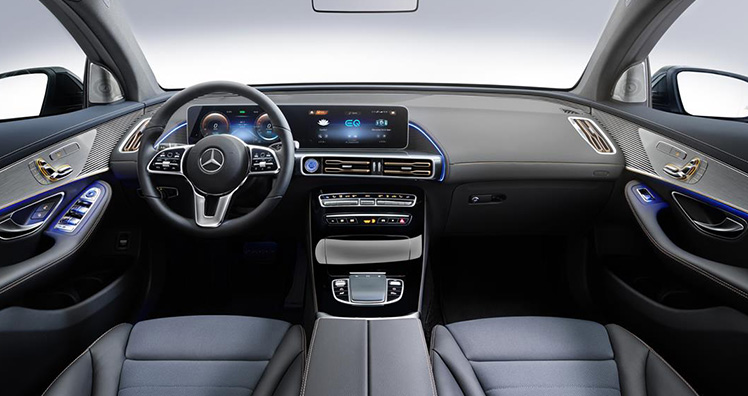 Auch im Innenraum ist der EQC Vorreiter einer avantgardistischen Elektro-Ästhetik. Ein Beispiel dafür ist der Lamellenkragen der Instrumententafel, der an die Kühlrippen eines Hi-Fi-Verstärkers erinnert. Die Instrumententafel ist als fahrerorientiertes Cockpit konzipiert. Das Mercedes-Benz typische Flügelprofil wurde asymmetrisch ausgeführt und im Fahrerbereich „aufgeschnitten“. Dort befindet sich als optisches Highlights des Cockpits, eine technisch anmutende, hochglanzlackierte Kassette, in der flach bauende Lüftungsdüsen mit schlüsselförmigen, roségoldfarbenen Lamellen sitzen.