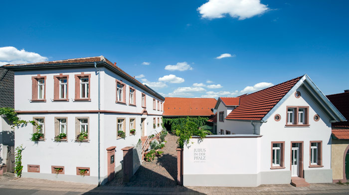 „Julius in der Pfalz“ ist ein historisches, ehemaliges Winzeranwesen in Hainfeld. Ulrike und Hartmut Julius Meimberg hauchten ihm neues Leben ein: edel ausgestattete Hotelzimmer, Appartements und ein Studio bieten Platz für wenige Gäste, die zumeist als Freunde wiederkehren. Auch hier kocht der Hausherr selbst: Julius‘ Stil ist eine Fusion von mediterraner und Pfälzer Küche, bei monatlichen Kochkursen weiht er in seine Küchengeheimnisse ein. Die Kursteilnehmer dürfen dabei selbst richtig Hand anlegen; das so gemeinsam kreierte 4-Gänge-Menü wird mit abgestimmter Weinbegleitung verzehrt. Zudem stehen Weinbergwanderungen, Weinproben, Winzerbesuche und Weinmenüs am Programm.