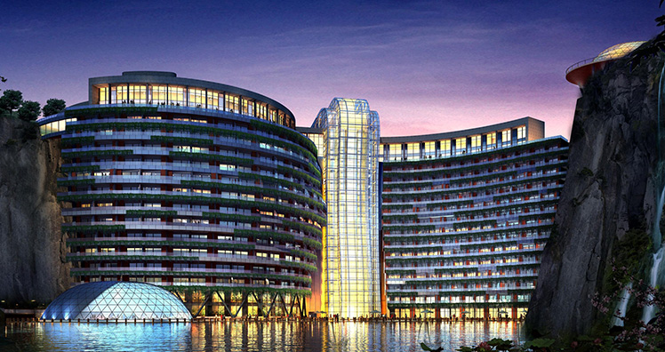 Ein Großteil des Hotelgebäudes, das noch heuer eröffnet werden soll, befindet sich nämlich in einem riesigen, 90 Meter tiefen Loch unterhalb der Erdoberfläche, in einer stillgelegten Mine. Für diesen spektakulären Plan erhielt das vom Immobilienkonzern Shimao Group errichtete und von der britischen InterContinental Hotels Group betriebene Hotel schon 2011 den Preis für das beste chinesische Zukunftsprojekt. Nach Schätzungen soll die Errichtung des „grünsten Hotels, das je gebaut wurde“, 500 Millionen Dollar gekostet haben.