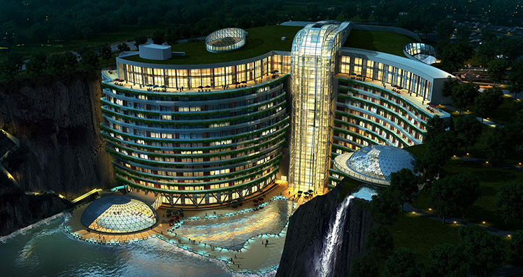 Das Fünf-Sterne-Luxushotel wird auf 61.000 Quadratmetern 1.000 Gästen, in 336 Zimmern und Suiten, Platz bieten. Inklusive Panoramablick auf die Wasserfälle der umgebenden Steinklippen. Von den 34 Stockwerken befinden sich 18 oberhalb der Erdoberfläche, die anderen 16 darunter. Zwei Hoteletagen mit Zimmern und einem Restaurant sollen überhaupt unter einem künstlichen See entstehen. Die Gäste blicken dann aus ihren Räumlichkeiten auf ein faszinierendes, unterirdisches Aquarium.