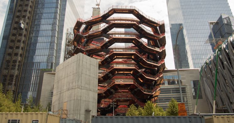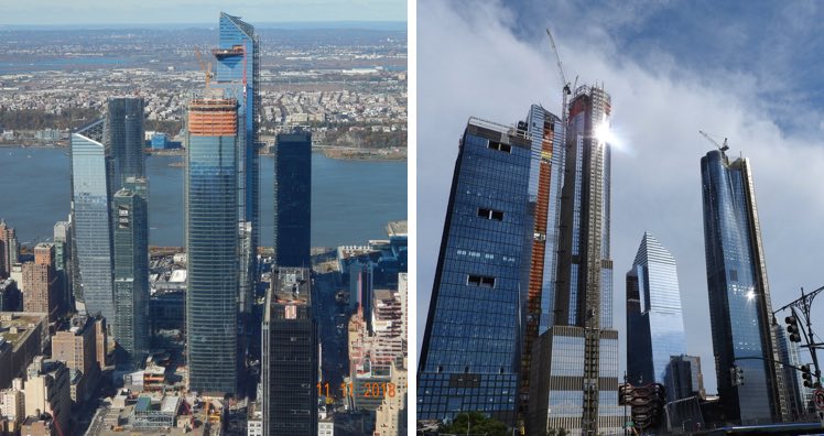 Das Luxus-Viertel Hudson Yards in Manhattan ist laut seinem Erbauer, das größte, mit 25 Milliarden Dollar, privat finanzierte Bauprojekt der USA. Rund ein Dutzend, von Star-Architekten entworfene, neue Luxus-Wolkenkratzer sind zum Teil schon fertig, befinden sich im Bau, oder sind zumindest schon geplant. Der Gebäudekomplex mit gewaltigen Dimensionen liegt am Hudson River, an der Westseite Manhattans, etwa auf Höhe des Empire State Buildings nahe der zum Park verwandelten Hochbahntrasse High Line.