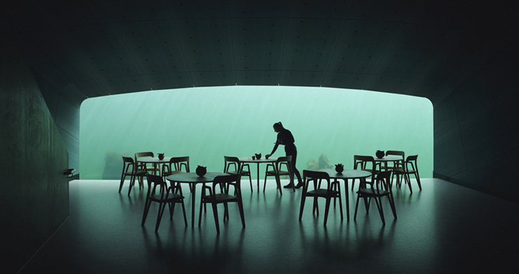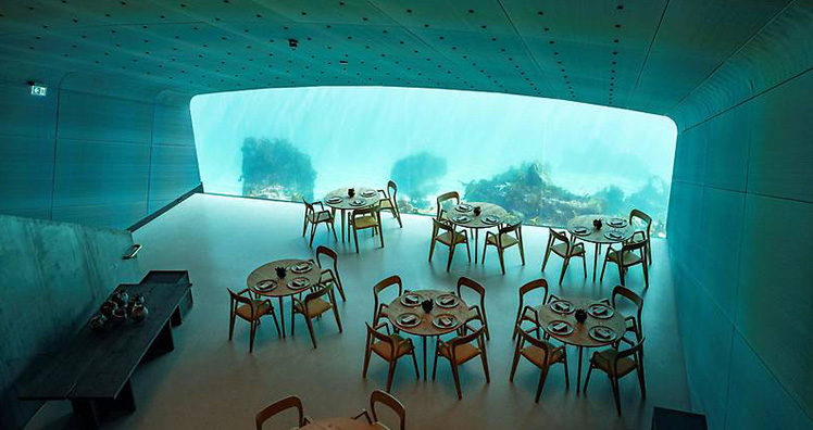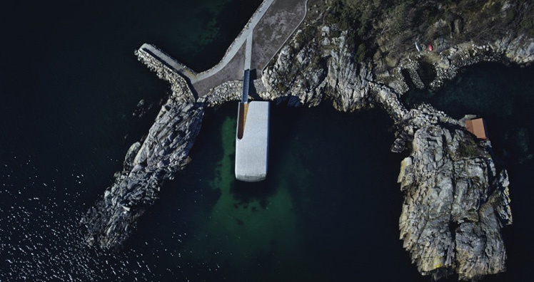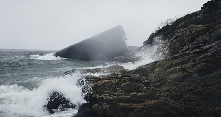 Umgeben von einer Weltuntergangsstimmung liegt das Restaurant wie der Teil eines Schiffes oder ein umgefallener Wolkenkratzer in Lindesnes an der Südspitze Norwegens, halb im Meer versunken. Das aus rohem Beton und Glas gefertigte Kunstwerk des mehrfach ausgezeichneten Architekturbüros Snøhetta passt genau in die raue Umgebung der Schärenküste. „Under“ bedeutet in der Landessprache sowohl „unter“ als auch „Wunder“, ein durchaus treffender Name für dieses Bauwerk. Dicke Betonwände, die an der schroffen Küstenlinie anliegen, halten dem Druck und den Stößen der rauen Meeresbedingungen wie in künstliches Riff stand. Im Laufe der Zeit, wenn sich Muscheln und andere Lebewesen auf der Fassade festsetzen, soll das Restaurant Teil der faszinierenden Unterwasserwelt werden.
