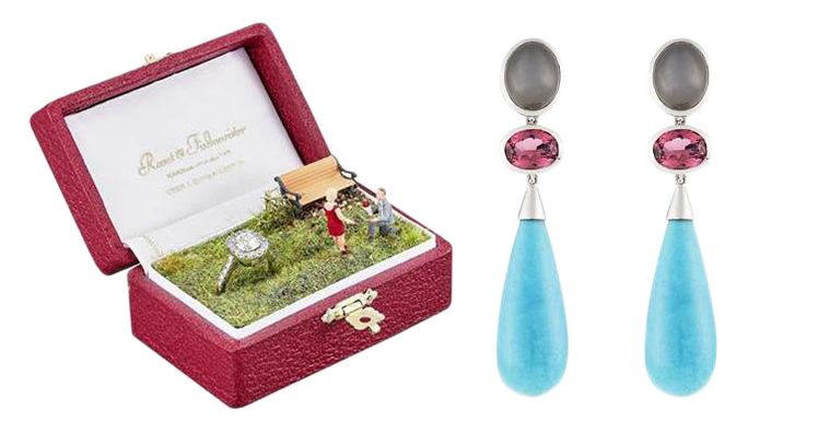 Die Verlobungs- und Hochzeitsringbox (Kreation Linda Oppermann) (5) von Rozet sowie Tropfenförmige Ohrgehänge (6) aus 750f Weißgold, Türkisen (6,28 ct), Mondsteinen und Rubelliten bringen Freudentränen.