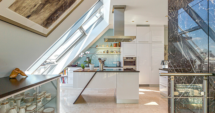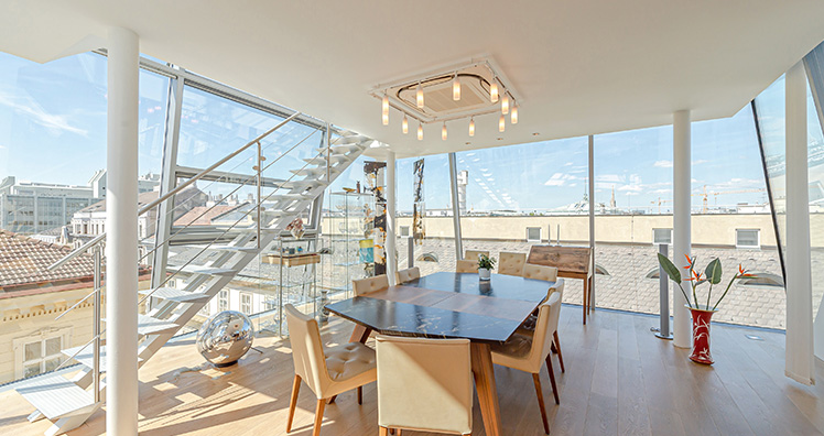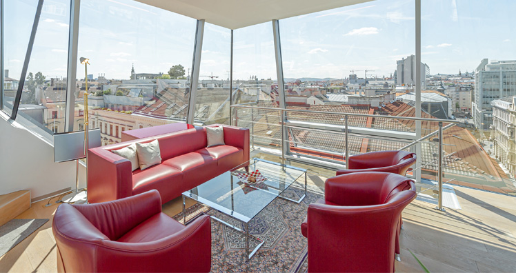 Sprichwörtlich über Wien residieren kann man dann noch einen Stock höher im gänzlich verglasten Wohnturm mit direktem Zugang zur 2. großen Dachterrasse mit Rundumblick über Wien. Hier herrscht Wohlfühlambiente pur!