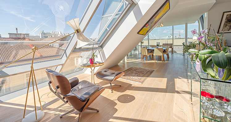 Das Penthouse bietet eine einzigartige Dachterrasse mit einmaligem Ambiente und traumhaften Rundumblick auf die Wiener Innenstadt. Die beiden großen Terrassen (ca. 25 und 64m²) sind sprichwörtlich Oasen im Herzen Wiens.