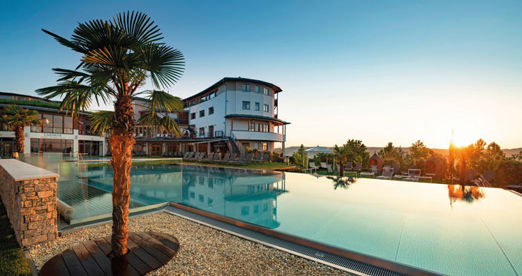 Ganze 70 Prozent mehr Wasserfläche, nämlich insgesamt 540 m2, stehen im Hotel & Spa Larimar****S seit Sommer 2019 zum Eintauchen bereit. Der neue Meerwasser-Außenpool lädt mit 30 Grad Celsius und 0,9 Prozent Salzgehalt zum schwerelosen Floaten unter der südburgenländischen Sonne ein. Ein zusätzlicher, 36 Grad Celsius warmer Meerwasserpool steht im textilfreien Saunabereich zur Verfügung. Salzwasser entschlackt, kurbelt die Regenerationskräfte des Körpers an und ist wie ein Jungbrunnen für Haut und Haare. Ein Hit ist auch der neue, 20 Meter lange Infinity-Sportpool mit 28 Grad Celsius warmem Süßwasser, Zeitmessung für Schwimmer und Sprudelbucht am Beckenrand. Damit verwöhnt die Larimar-Wasserwelt bereits mit acht Pools drinnen und draußen.