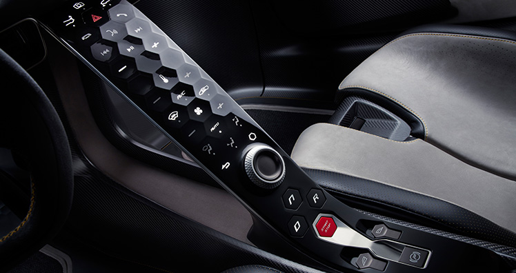 Der Fahrer steuert den Evija mit einem rechteckigen Sportlenkrad, er sitzt in einem Carbonschalensitz vor einem Kombiinstrument und einer freischwebenden Mittelkonsole, in der auch Druckknöpfe für die Gangauswahl integriert sind. Kameras zeigen auf Displays in den Türen den rückwärtigen Verkehr, Außenspiegel gibt es keine.