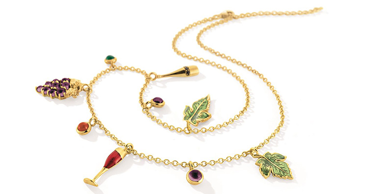 In feinsten Kreationen huldigt die Kollektion den österreichischen Weinklassikern wie dem Grünen Veltliner, dem Blaufränkischen, Zweigelt und DAC. Das edle Collier aus der Serie „Blaufränkisch“ ist ein wahres Meisterwerk der Juwelierskunst. Weinlaub aus purem 585 Gelbgold rankt sich darin um handgefasste Iolith-Beeren in ihrer charakteristischen blauvioletten Farbe und umschmeichelt perfekt den Hals der Trägerin. Komplettiert wird der Look durch elegante goldene Ohrstecker in der Form von Weinlaub.