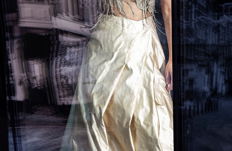 Der Bezug zu Venedig, dieses besondere Flair, die Opulenz finden sich in den verwendeten Stickereien und der Art der Drapierung wieder. Die Magie und diese einzigartige Stimmung, die man nur in Venedig verspürt, versuchte die Designerin Michel Mayer in ihrer aktuellen Kollektion einzufangen. Die teils historisch anmutenden Schnitte und Stickereien wurden auf transparentem Tüll drapiert und mit opulenten Materialien wie Seidenduchesse und Seidentaft zu großen Roben verarbeitet.