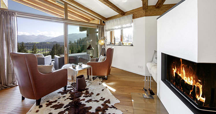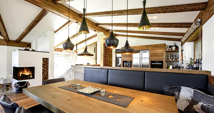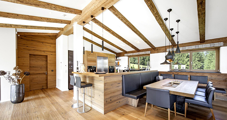 Eines der vielen Highlights ist der offene Wohn/Essbereich mit Altholz-Sichtdachstuhl im Dachgeschoss des Chalets. Hohe Räume sorgen für ein alpines Wohngefühl. Der Masterbereich ist ebenfalls im Dachgeschoss untergebracht. Dieser setzt sich aus Schlafzimmer, Bad und einer Ankleide zusammen. Die Voll Verglasung im Badezimmer bietet einen herrlichen Blick auf die unverbaubare Wiese, den Waldrand und den Wilden Kaiser. Das voll möblierte Luxus Chalet zeichnet sich durch ein durchdachtes Konzept, spektakulären Blickachsen in die Berge und alpinen Materialien aus.