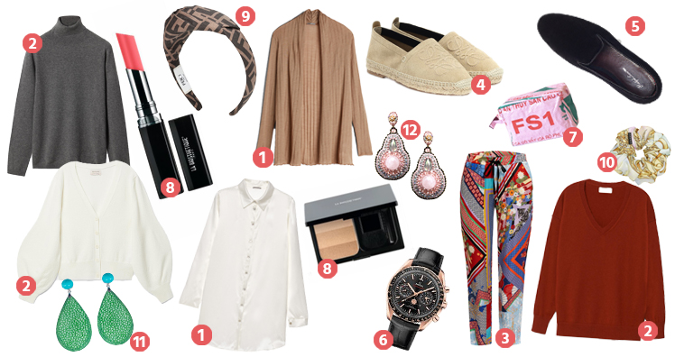 Farbe ins Spiel bringt die Hose von Pinko (3), bequem und atmungsaktiv dazu das beigefarbene Paar Schuhe von Loewe (4). Es wurde aus weichem Veloursleder in Italien gefertigt und mit einer Bastsohle, hellen Nähten und einer Logoprägung versehen.