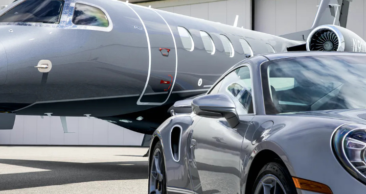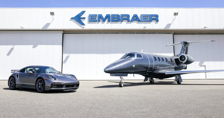 Porsche und Flugzeughersteller Embraer haben ein besonderes Set für betuchte Kunden zusammengestellt. Das Design des Businessjets und des Sportwagens sind perfekt aufeinander abgestimmt, auch das Interieur ziert diese Handschrift. Für die Zusammenarbeit wurde außerdem ein gemeinsames Logo entworfen. Dieses besteht aus einem stilisierten Flugzeugflügel der Phenom 300E und dem Heckflügel des Spitzen-Elfers aus dem Sport Design-Paket.