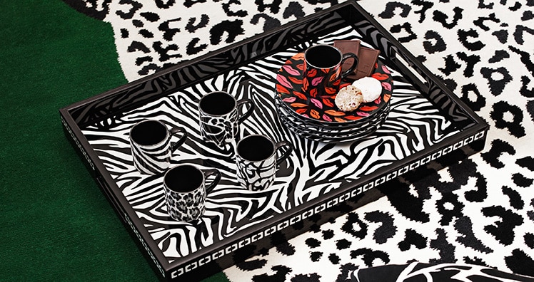 Zu den Key Pieces gehören doppelseitige Wolldecken, die über dem Bett oder Sofa drapiert werden können, dekorative, bedruckte Boxen zur Aufbewahrung glamouröser Schätze, gelackte Tabletts und eine Reihe von Duftkerzen, die in bedrucktem Glas zum Hingucker werden und elegant im Haus platziert werden können.