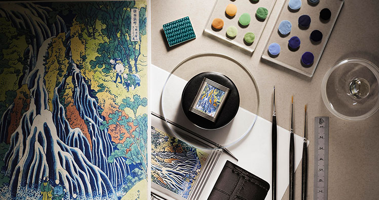 Um die Kraft und die Schönheit des 100 Meter den Hang hinab fallenden Wassers zum Ausdruck zu bringen, verwendete Hokusai für Kirifuri Wasserfall eine stärker ausgeprägte Perspektive und markantere Farben als in seinen vorherigen Werken. Die Emailleurin musste nicht nur dies perfekt nachbilden, sondern auch die Illusion eines Holzschnittes erzeugen, dessen Aspekt sich grundlegend von dem des Emaillierens unterscheidet. Eine besondere Herausforderung bestand darin, dass mehrfarbige Drucke die aufeinanderfolgende Verwendung mehrerer Holzschnitte erfordern – von denen jeder das Auftragen einer anderen Farbe ermöglicht – und hinzu kam noch die Nachbildung des Bokashi-Effekts der subtilen, abgestuften Farbnuancen, wie sie im Original zu sehen sind. Um diese Illusionen zu erzeugen, musste die Meisteremailleurin von Jaeger-LeCoultre ihre eigene Technik entwickeln.