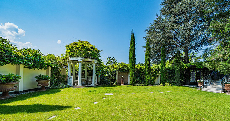Der dazugehörige Garten, die Auswahl der Bepflanzung, der Pavillon, die liebevollen Details und die hügelige Landschaft im Hintergrund erzeugen ein toskanisches Flair.