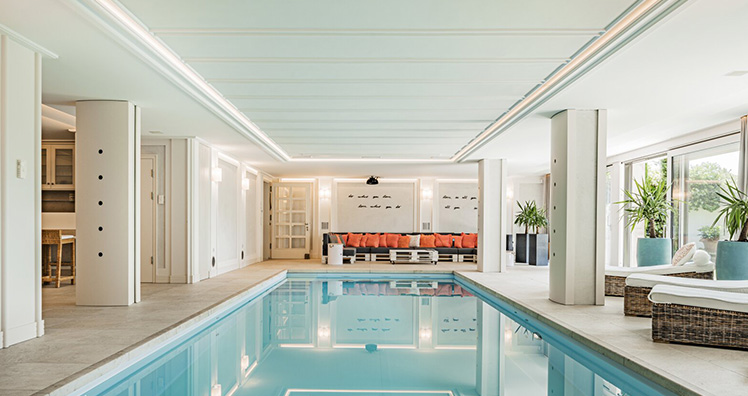 Der Wellnessbereich besticht durch einen Pool mit Gegenstromanlage, eine Infrarotkabine, eine Dampf-Sauna, zahlreiche Fitnessgeräte sowie eine eigene Poolbar und eine Heimkino-Anlage.