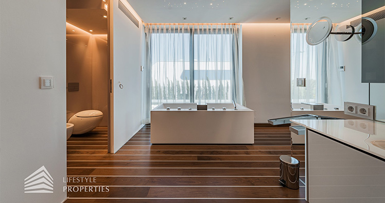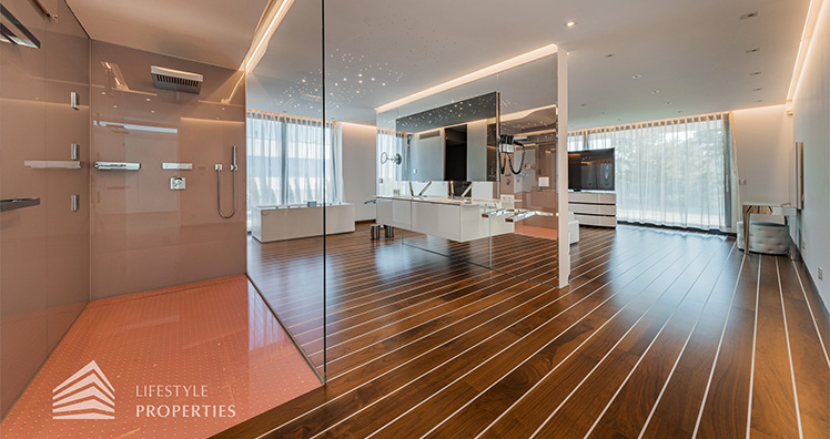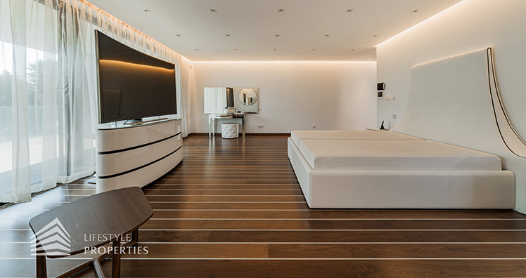 Das absolute Highlight stellt jedoch das Master-Bedroom mit einem En-Suite Badezimmer und einem in der Wanne integrierten Whirlpool, einem eleganten walk-in Closet mit lederüberspannten Türen und einem Balkon mit ca. 21 m², dar.