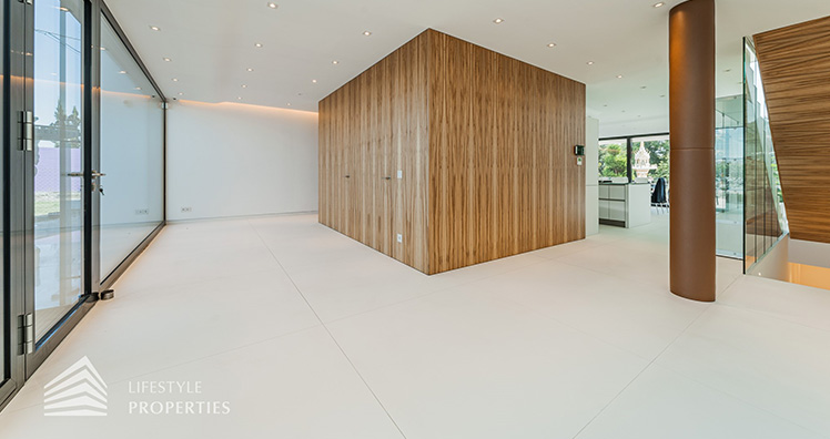 Die Nutzfläche von ca. 589 m² erstreckt sich über 3 Geschoße. Durch eine Hochsicherheitstüre gelangen Sie in den großzügigen Vorraum im Erdgeschoß. Alternativ können Sie die Villa auch über die Doppelgarage betreten.
