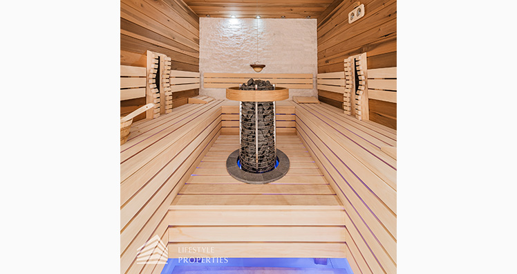 Neben einer Sauna, einem Dampfbad mit Deckenleuchten von Swarovski, einer Dusche, sowie einer separaten Toilette, befindet sich hier auch ein Raum der sich perfekt als Fitnessraum eignen würde.