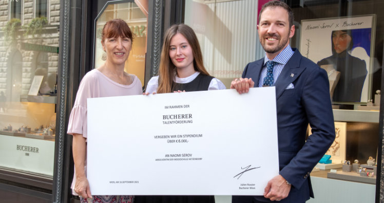Im Rahmen dieses Salon Blue wurde auch die Bucherer Talenteförderung ins Leben gerufen, wo jährlich eine AbsolventIn der Abschlussklasse der Modeschule Hetzendorf mit einem Stipendium gefördert und präsentiert wird. Naomi Serov erhält als Erste den Preis, aufgrund ihrer, perfekt zu Bucherer passenden Abschlussarbeit, mit der sie sich der Betonung des weiblichen Dekoltees verschrieben und extravagante Krägen entworfen hat. Eine besondere Hommage an die Essenz, an gekonntes Recycling und an seine Relevanz in der nachhaltigen Mode unserer Zeit.