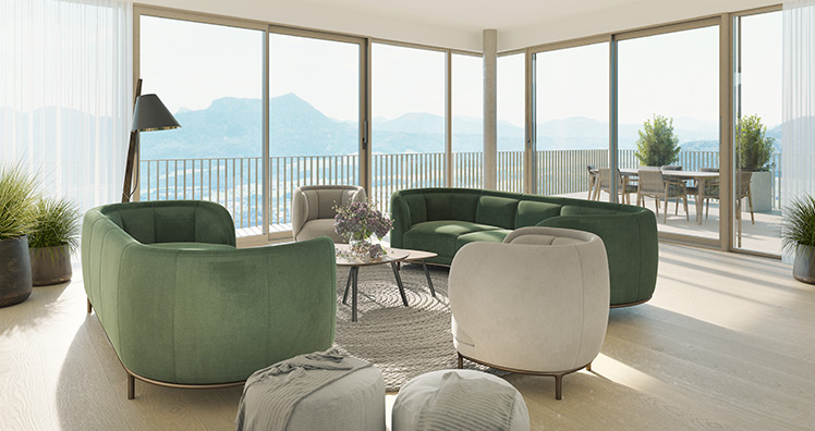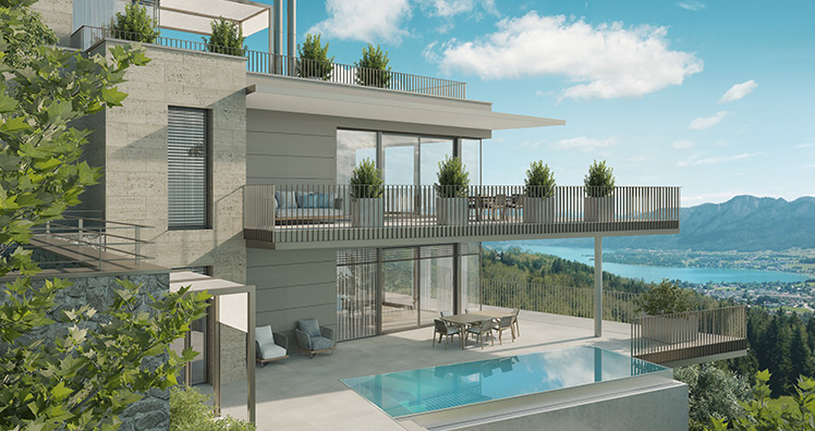 Jede Wohneinheit ist ein barrierefreies Ensemble voller Leichtigkeit und zeitloser Eleganz. Sonnig, unverbaubar und in werthaltiger Top-Hanglage über dem Mondsee. Ein Rückzugsort, der durch ein großzügiges, offenes Design mit raumhohen Fensterflächen besticht.