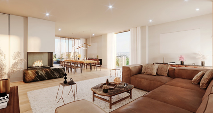 Und dann gibt es noch wohlbedachte Details, die für die Freude am Wohnen einen so großen Unterschied machen: Raumhöhen wie in einem Altbau, gediegene Hölzer und Steine, Innentüren – teils aus Glas – mit unsichtbarer Zarge und wandbündigem Türblatt, die vom Boden bis zur Decke reichen und viele breite Stellplätze in der Garage.