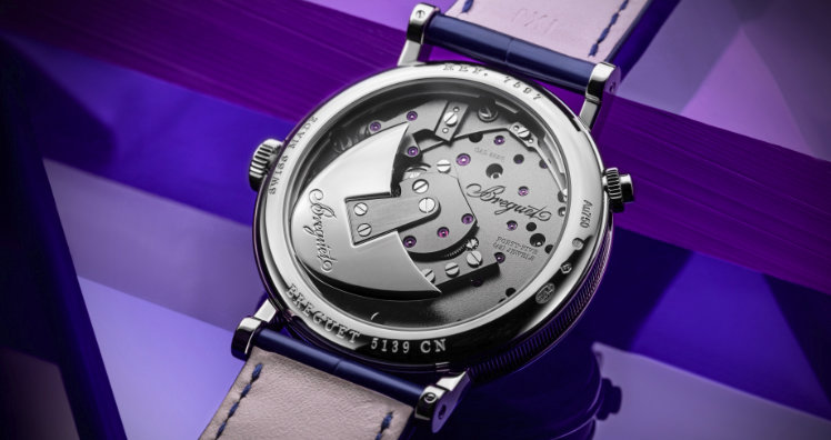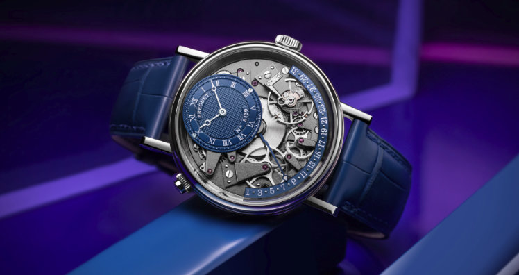 Ein Saphirglasboden gibt den Blick auf die goldene Schwungmasse, deren Form an jene der perpetuellen Uhr erinnert, die Abraham-Louis Breguet 1780 kreiert hatte, frei. Passend zum Zifferblatt hält ein nachtblaues Alligatorlederband mit einer goldenen Dornschließe die neue Breguet Tradition 7597.