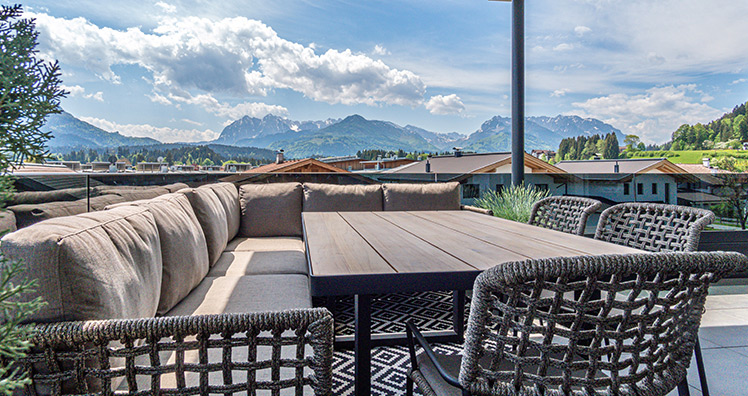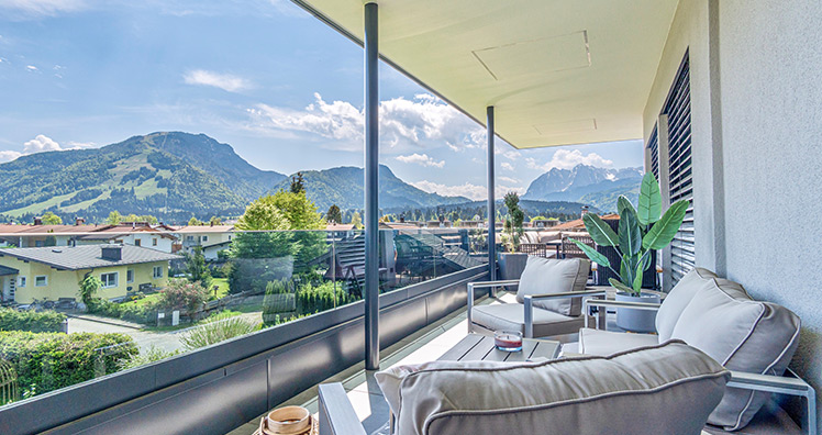Der Wilde Kaiser zeigt den Erlengrund Residence Bewohnern im Abendrot auch seine zahme Seite. Lebensgefühl pur inmitten von Tirols ursprünglicher Natur, auf höchstem Wohnkomfort.