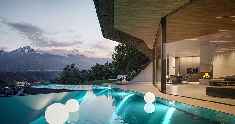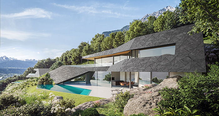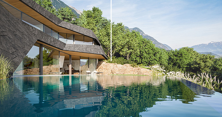 Die beiden geplanten Villen punkten mit futuristischer Anmutung und präsentieren sich aufregend extravagant. Sie erscheinen wie aus dem Felsen geformt, der sie umgibt. Dadurch entstehen zurückhaltende Baukörper, die der raumbildenden Vegetation mehr Platz geben und das Bild eines zusammenhängenden Grünraums verstärken