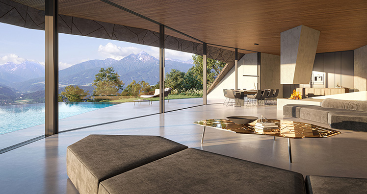 Hoch über Innsbruck entstehen nun zwei Villen am Hang umgeben von atemberaubender Natur. Der private Wald, der Teil des Elysion ist, birgt Orte der Ruhe und Entspannung. Die großflächigen Verglasungen eröffnen nicht nur den spektakulären Blick über Innsbruck, sie holen auch die Natur ins Innere des Hauses.
