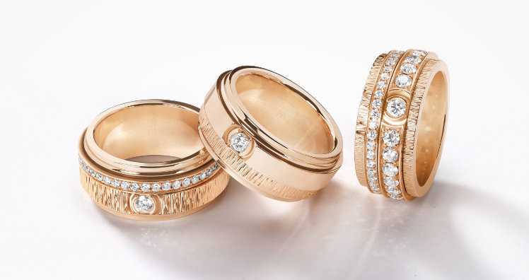 Jeden Ring und Ohrring ziert ein Diamant, der durch zwei ihn umschließende Halbkugeln aus Gold akzentuiert wird. Piaget versteht es, Farbe, Volumen und Texturen in einem unverwechselbaren künstlerischen Ansatz zusammenzuführen. Mit einem oder zwei besetzten Drehringen, halbmondförmig gefassten Diamanten, größeren oder kleineren Formaten, Weiß- oder Roségold, dokumentieren diese neuen Ringe perfekt die Kreativität und das Savoir-faire Piagets.