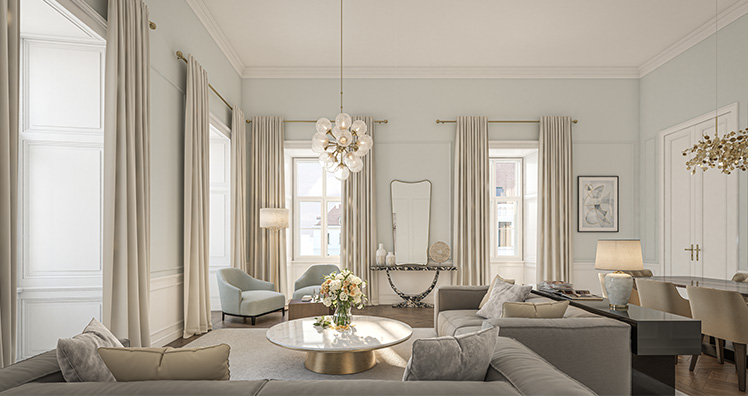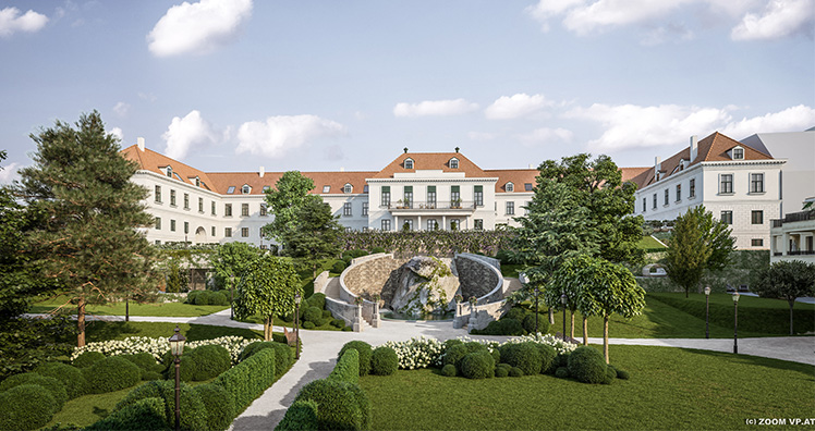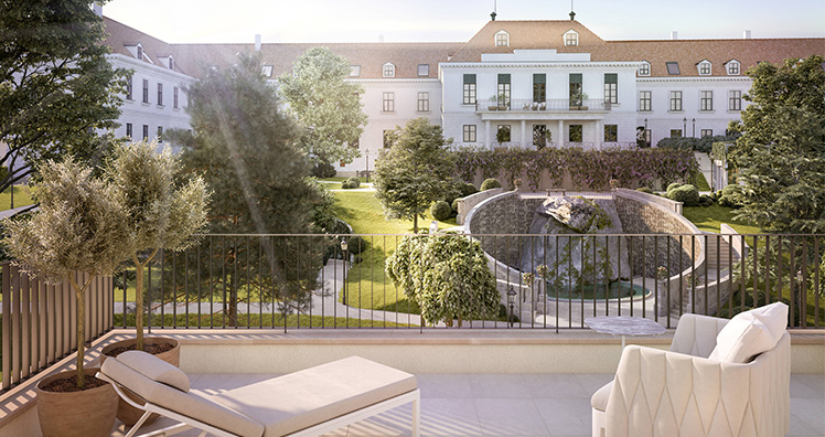 Ein hauseigener Degustationskeller mit privaten Weinkellern, ein exklusives Spa mit Indoor-Pool und Sauna, alles direkt in den idyllischen Kellergewölben des Schlosses gelegen, eignen sich ideal zum Entschleunigen im kleinen Kreis aber auch für gemütliche Abende mit Freunden oder Geschäftspartnern. All diese Annehmlichkeiten stehen perfekt gepflegt rund um die Uhr zur Verfügung, sodass sich die zukünftigen Bewohner:innen um nichts kümmern müssen. Die großzügig konzipierten Eigentumswohnungen ab einer Wohnfläche von rund 130m2 und Raumhöhen von rund 5,6 Metern verfügen alle über weiträumige Terrassen oder Balkone und garantieren wunderschöne Ausblicke in den prachtvollen Schlosspark.