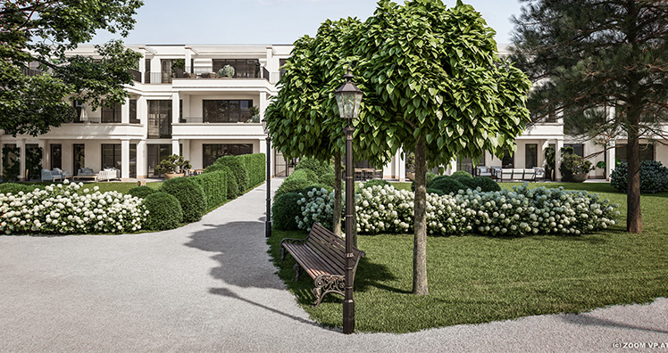 Den Mittelpunkt des geschlossenen Ensembles bildet der 5.000m2 große Schlosspark mit seinem wunderschönen Baumbestand und dem denkmalgeschützten Brunnen. Die vom Gartengestalter Lederleitner geplante weitläufige Parkanlage, wird den künftigen Bewohner:innen des Schlossparks Freihof als grünes Refugium und privater Erholungsraum dienen.