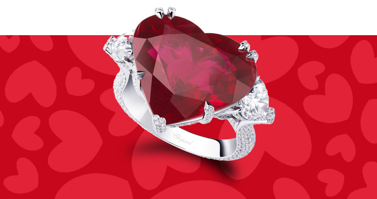 Der Rubin ist der Stein der Liebe und der Emotionen. Caroline Scheufele, künstlerische Leiterin und Co-Präsidentin von Chopard, liebt Edelsteine und hat sich von einem leuchtend roten, herzförmigen Rubin mit dem außergewöhnlichen Gewicht von mehr als 18 Karat inspirieren lassen. Das Juwel stammt aus einer Mine in Mosambik und steht nun im Mittelpunkt eines Rings aus Fairmined-zertifiziertem ethischem Weißgold – gerahmt von zwei herzförmigen Diamanten. Das Design des Schmuckstücks ist betont schlicht gehalten und steht für die Aufrichtigkeit einer wunderschönen Liebeserklärung.