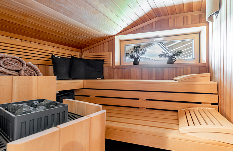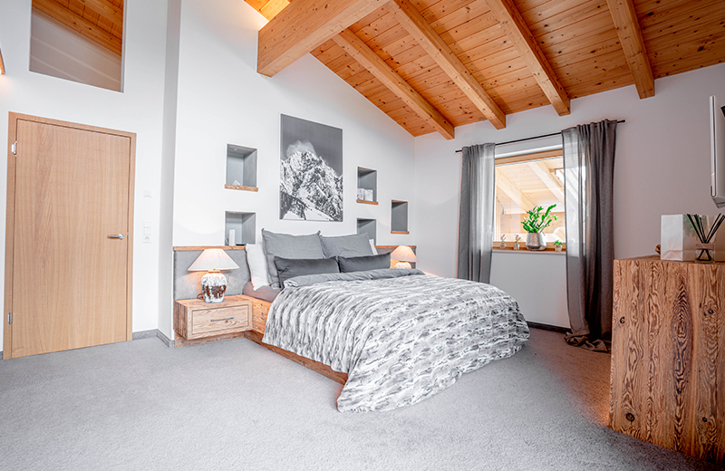 Ein weiteres Schlafzimmer im Erdgeschoss sowie insgesamt drei hochwertig ausgestattete Bäder komplettieren das Raumangebot. Das Masterbad bietet zudem eine Sauna mit Bergblick.