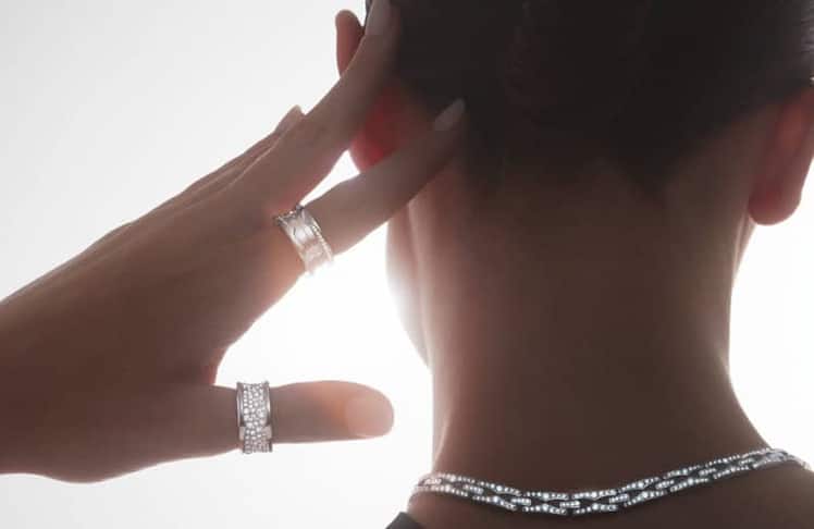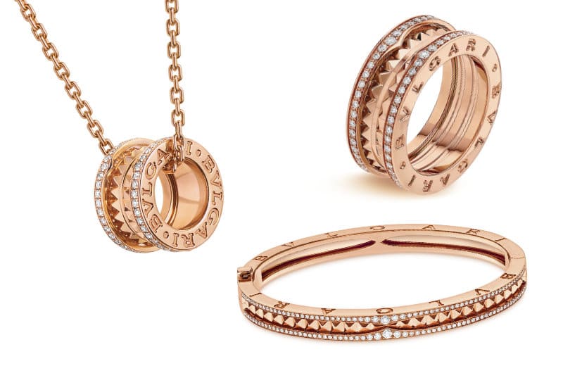 Der B.zero1 Rock 2-Band-Ring ist an goldenen Nieten und einem edlen Diamant-Pavé erkennbar, die Halskette mit Anhänger aus 18-karätigem Roségold, Nieten und Diamant-Pavé an den Rändern vereint modernes Design mit der Zeitlosigkeit von Diamanten. Auch auf dem Armreif werden die kraftvollen Linien der berühmten Designikone mit goldenen Nieten und kostbarem Diamant-Pavé neu interpretiert.