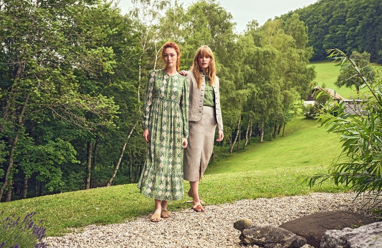 Im März schließt die große Kapsel "Monochrome" an, eine Farbwelt aus Marshmallow, Stein, Taupe und Lorbeer. Die Printmotive und Schattendrucke nehmen diese Töne gekonnt auf und lassen so einen leisen Dialog aus Uni und Muster entstehen. Tier-Motiv-Prints im Pop-Up-Stil lockern das Trachtenthema mit einem Augenzwinkern auf und machen die alpine Inspiration noch alltagstauglicher. Maxikleider mit Volants, wadenlange Röcke mit feinen Biesen und für den Mann Westen und Sakkos mit kleinem Stehkragen, mal tonig, mal im Kontrast abgesetzt, wie es für die Tracht so typisch ist.