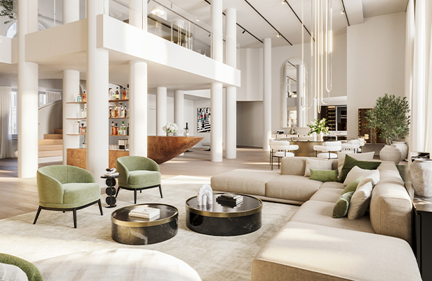In diesem prachtvollen Gründerzeithaus wurde der historische Saal in eine atemberaubende zweigeschossige Grand Etage verwandelt. Die erste Ebene empfängt Sie mit einem eindrucksvollen Eingangsbereich, der in den lichtdurchfluteten Wohnraum mit bodentiefen Kastenfenstern und einer eigenen Weinlounge führt. Hier finden Sie auch das Hauptschlafzimmer mit einer großzügigen Ankleide, einer Sauna und einem Badezimmer im ehemaligen Turm. Über eine elegante Wendeltreppe gelangen Sie zur zweiten Ebene mit imposanter Galerie und weiteren Schlafzimmern.